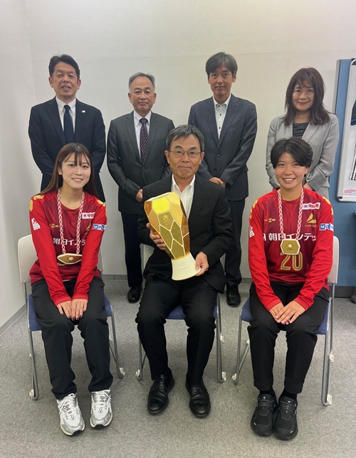 10月21日、朝日インテック・ラブリッジ名古屋(堀田崇代表取締役、上田真子選手、木下咲帆選手)が「2025プレナスなでしこリーグ1部」優勝のご報告のため、ご来訪されました。